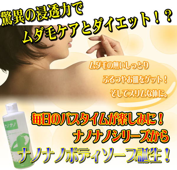 驚異の浸透力でムダ毛ケアとダイエット! 天然エキス5種類と最強タッグでムダ毛をなくす! グレープフルーツ果皮油配合でダイエット効果♪ ヒアルロン酸配合でぷるつやお肌♪ 詳しい説明、商品のご購入は以下のリンクをクリックしてください。 ナノナノボディソープ 洗ってムダ毛ケア!ヒアルロン酸配合でぷるつやお肌もゲット!
